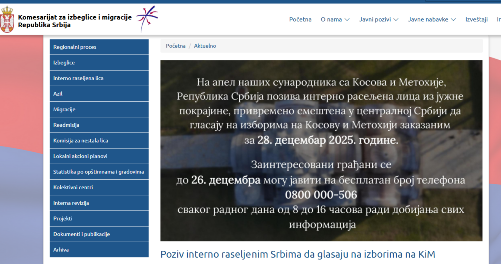 Komisariati për Refugjatët dhe Emigrantët në Serbi ka lëshuar një thirrje zyrtare lidhje me zgjedhjet e 28 dhjetorit që do të mbahen në Republikën e Kosovës duke iu bërë thirrje serbëve të zhvendosur në Serbi që të marrin pjesë në zgjedhjet e 28 dhjetorit.