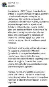 Shefi Peci ka sqaruar se kontrata për shërbimet primare që hyn në domenin e Drejtorisë së Mjedisit është aktive me “Unitetin” për të gjitha fshatrat dhe zonat urbane, dhe se këto shërbime po realizohen sipas orareve dhe planit operativ.
