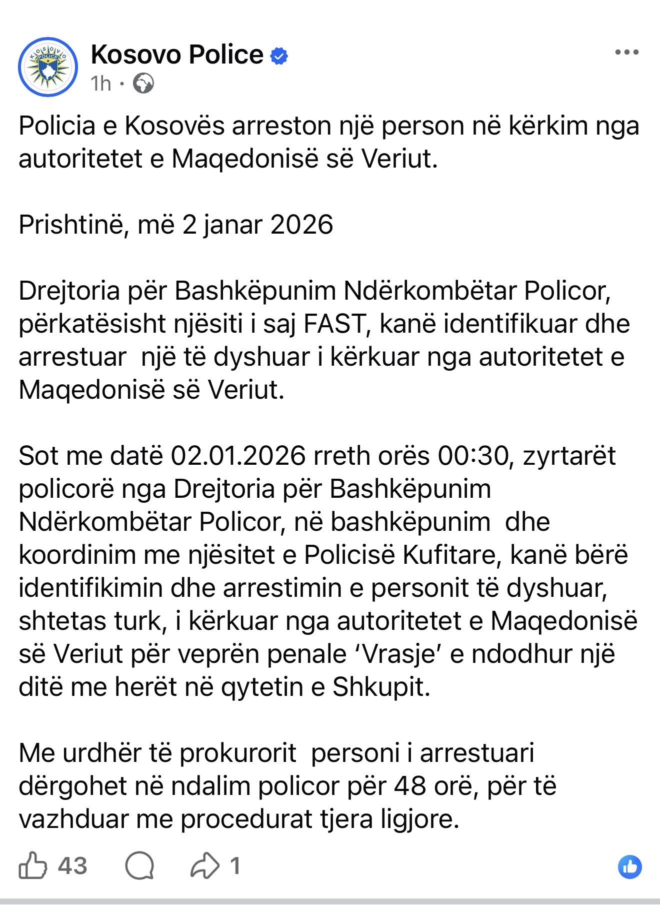 “Drejtoria Rajonale e Policisë në Ferizaj falënderon qytetarin D. Mehmetaj për veprimin e tij shembullor, ndershmërinë dhe bashkëpunimin me institucionet, duke vlerësuar këtë rast si një shembull të mirë qytetarie dhe përgjegjësie shoqërore”.