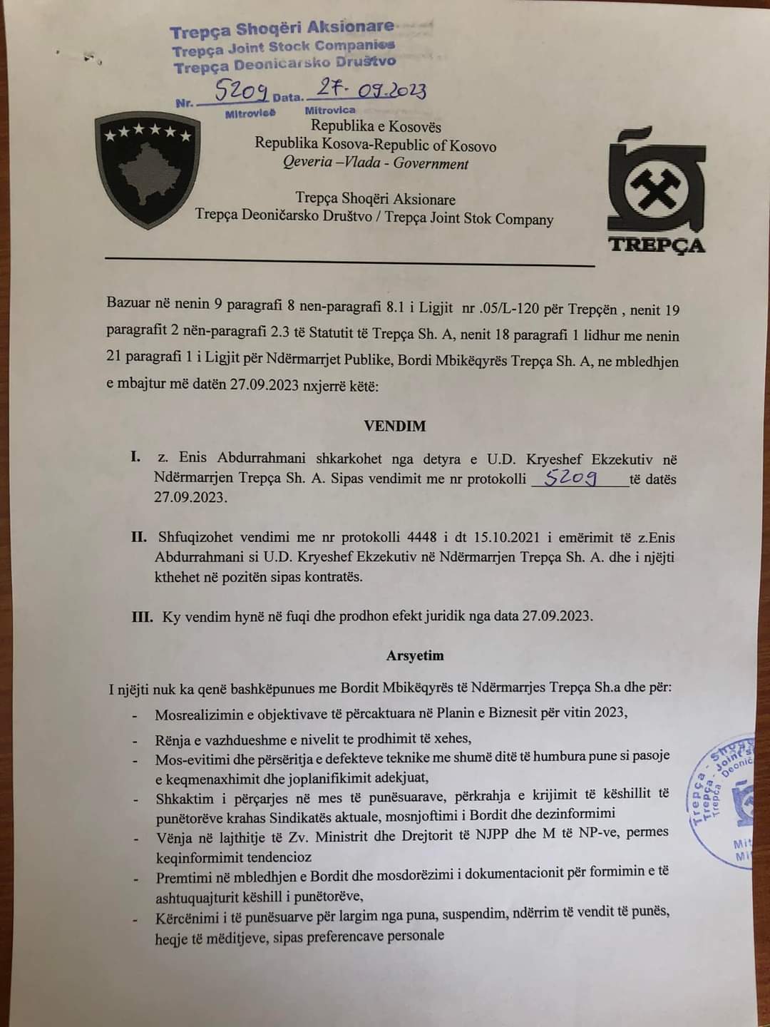 Për shkak te mos përmbushjes se detyrave te punës, neglizhencës dhe keq menaxhimit Bordi Mbikëqyrës i “Trepça”, Sh. A. vendosi njëzëri te shkarkoje nga detyra e U.D. Kryeshefit të “Trepça”, Sh. A. z. Enis Abdurrahmani. Ne te njëjtën mbledhje Bordi Mbikëqyrës i “Trepça”, Sh. A. emëroi ne detyrën e U.D. Kryeshefit Ekzekutive te Trepça SHA, z. Enis Muzaqi, dhe kërkoj rritje te angazhimit ne te gjitha nivelet pasi puna e secilit do matet ne rezultate javore dhe mujore.