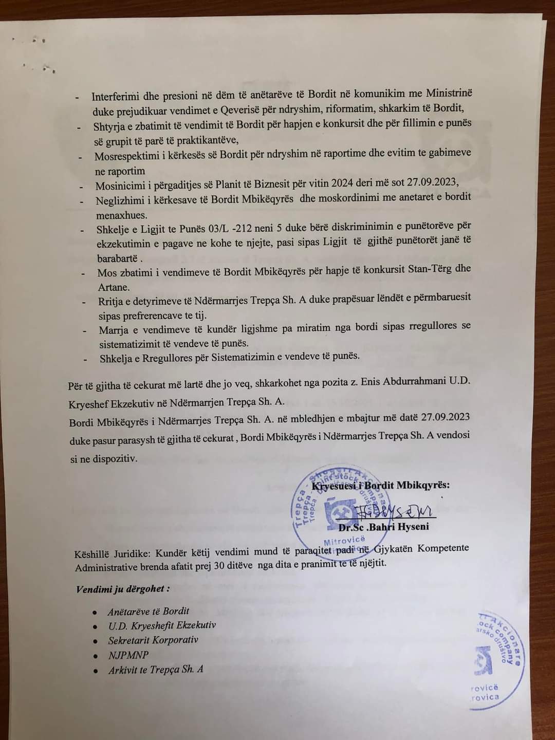 Sot me dt.27.09.2023 (e Mërkurë), duke filluar nga ora 10:00 u mbajt mbledhja e XXX-të e Bordit Mbikëqyrës të “Trepça”, Sh. A., sipas këtij Rendi te ditës.