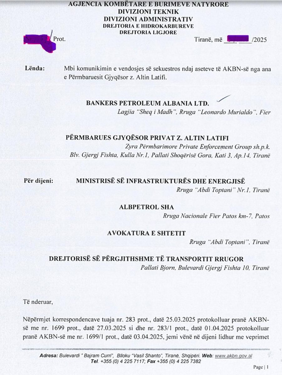 “Në nenin 11.1.1 të Marrëveshjes Hidrokarbure parashikohet se asetet e luajtshme dhe të paluajtshme, të cilat janë krijuar në këtë liçencë marrëveshje dhe marrëveshje hidrokarbure, bëhen pronë e AKBN pas përfundimit të marrëveshjes hidrokarbure, mbylljes së saj, ose në momentin e mbulimit të tyre si kosto hidrokarbure,” shkruhet në shkresën që AKBN i nisi Bankersit dhe zyrës së përmbarimit.