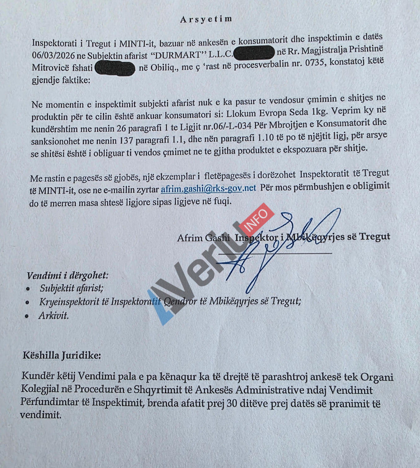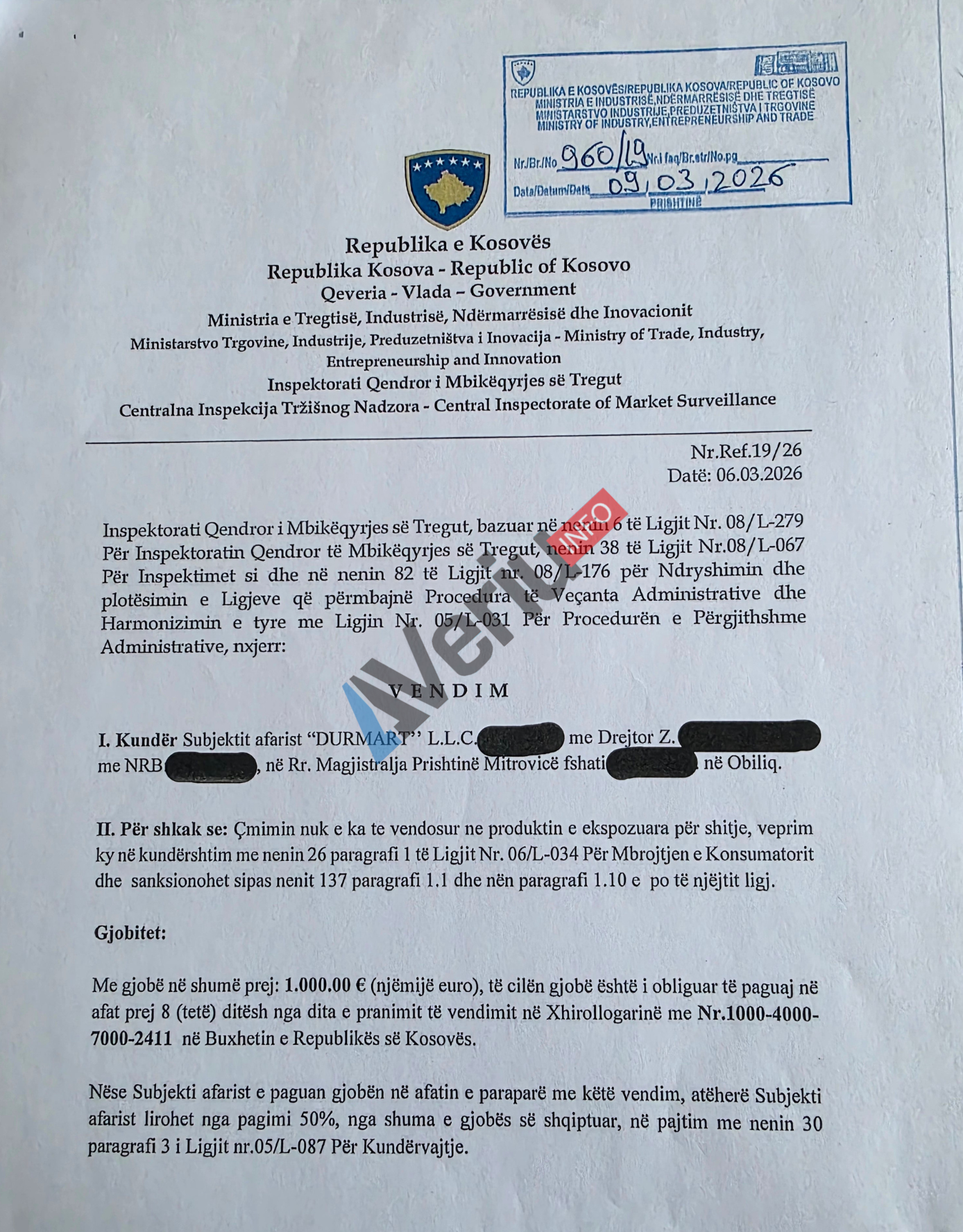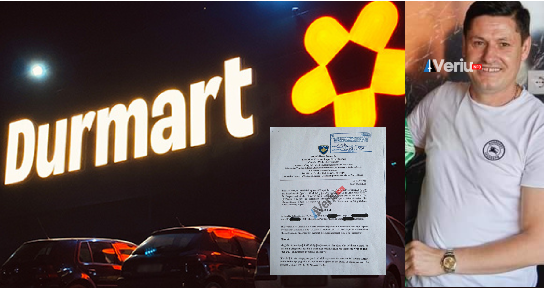 Veriu.info ka siguruar një vendim të Inspektoratit Qendror të Mbikëqyrjes së Tregut të Ministrisë së Tregtisë, me të cilin është gjobitur me 1 mijë euro kompania “Durmart” L.L.C., e cila menaxhon me rrjetin e marketeve Durmart.