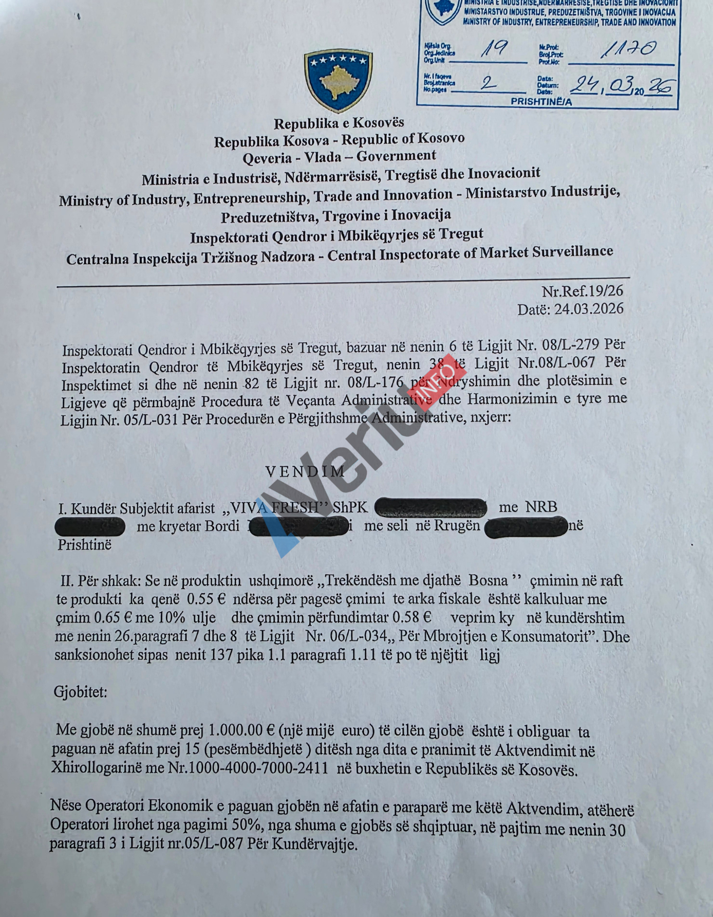 Veriu.info ka siguruar një vendim të Inspektoratit Qendror të Mbikëqyrjes së Tregut, me të cilin është gjobitur ‘simbolikisht’ me 1 mijë euro kompania “Viva Fresh” Sh.P.K. për shitje në arkë të produktit me çmim më të lartë se sa çmimi që ishte vendosur në raft.