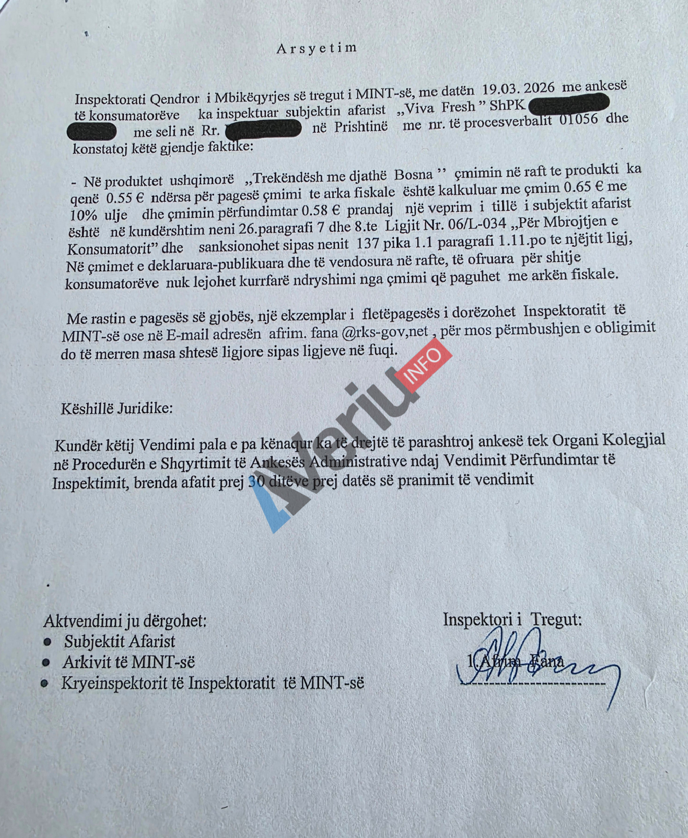 Në arsyetimin e vendimit të IQMT-së thuhet se më 19 mars 2026 kanë pranuar ankesë nga një konsumator, me ç’rast kanë kryer një inspektim në “Viva Fresh” – Prishtinë, ku është konstatuar se produkti “Trekëndësh me djath Bosna” është kalkuluar në arkë me çmim më të lartë se sa në raft.