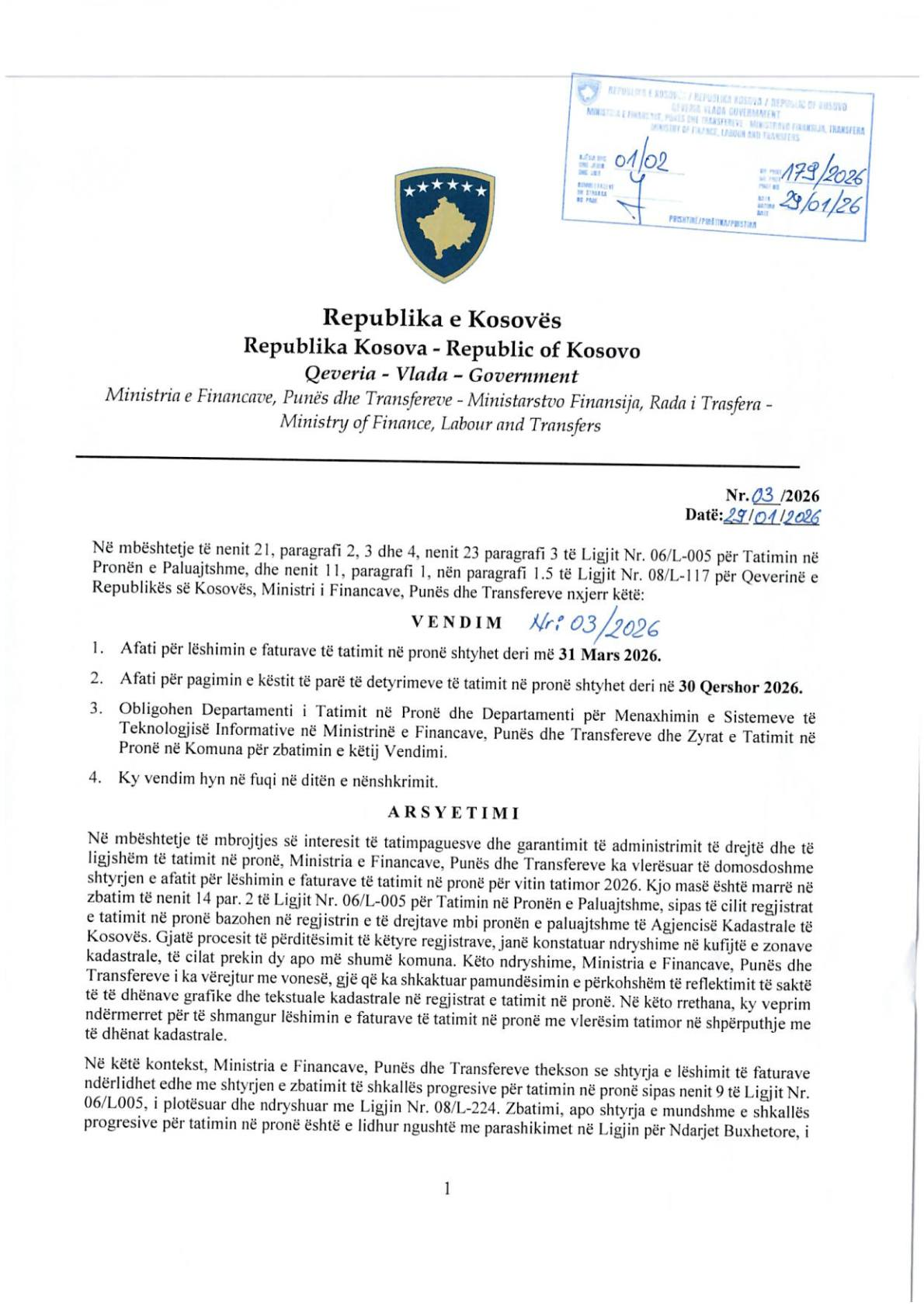 Ministria e Financave e ka shtyrë afatin për tatimin në pronë për vitin 2026.