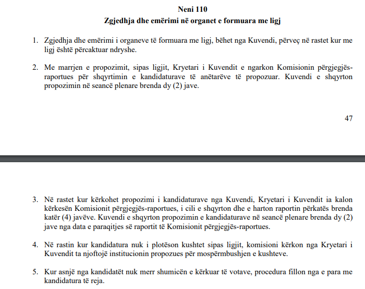 Neni 110 i Rregullores së Punës së Kuvendit thotë se në raste kur kandidatët nuk i plotësojnë kushtet, atëherë Kryetari i Kuvendit duhet ta njoftojë institucionin në fjalë për këtë fakt. Pra, Komisioni kishte pretenduar se këta anëtarë nuk i plotësojnë kushtet.