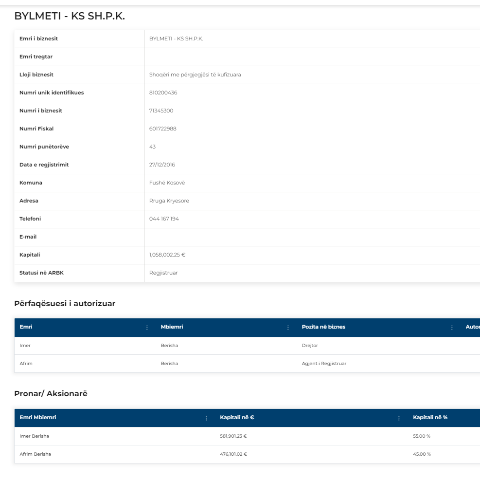 Ndryshe, kompania ‘Bylmeti – KS’ Sh.P.K. pjesë e së cilës është qumështorja ‘Bylmeti’ është në pronësi të Imer Berisha dhe Afrim Berisha./Veriu.info