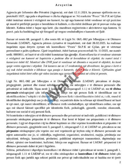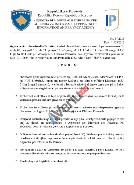 Tutje në vendimin e siguruar nga Veriu.info, thuhet se “Proex” Sh.P.K (Interex, njësia 5343984 – Gjilan), njësia në cilësinë e kontrolluesit, ka përpunuar të dhëna personale përmes sistemit të vëzhgimit me kamerë në kundërshtim me nenin 4, nenin 5 dhe nenin 78 paragrafin 3 të LMDhP-së.