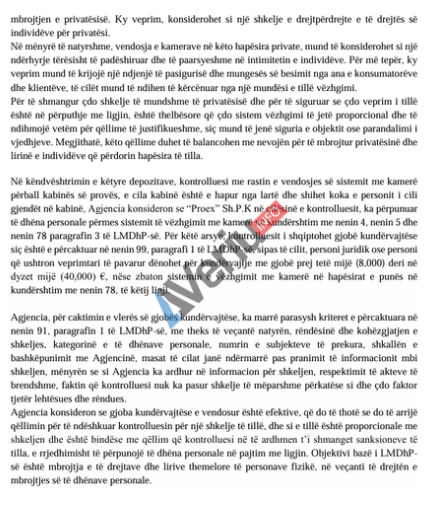 “Nenin 78, paragrafi 3, i LMDhP-së, ka përcaktuar se vëzhgimin me kamerë ndalohet në hapësirat jashtë vendit të punës, veçanërisht në dhoma të ndërrimit, ashensorë, hapësira sanitare dhe në hapësira pune me potencial të shkeljes së privatësisë së të punësuarve. Një individ që ndodhet në një kabinë prove ka të drejtën të ndiejë se po gëzon një nivel të garantuar të privatësisë, që është e paprekshme dhe e pamundësuar për t’u cenuar nga ndonjë formë vëzhgimi. Kabinat e provës janë të vendosura pikërisht për t’u ofruar individëve mundësinë për të provuar rroba pa pasur frikë se mund të jenë të ekspozuar ndaj vështrimeve të huaja. Vendosja e sistemi të vëzhgimit me kamera, të instaluar nga kontrolluesi përballë një kabine prove e cila është e hapur nga lartë dhe shihet koka e personit i cili gjendët në kabinë, ngre shqetësime të konsiderueshme mbi mbrojtjen e privatësisë. Ky veprim, konsiderohet si një shkelje e drejtpërdrejtë e të drejtës së individëve për privatësi”, thuhet në vendimin e AIP.
