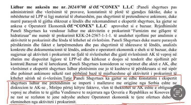 Në të njëjtin vendim, OSHP kishte ritheksuar se autoritetet kontraktuese janë të detyruara të zbatojnë vendimet e Qeverisë, përfshirë edhe ndalimin e përdorimit të mallrave me origjinë nga Serbia në furnizimet publike. Megjithatë, insistimi i KEK për të vijuar me këtë kompani duket se është shpërblyer, pasi tashmë, sipas vendimit të datës 4 shtator 2025, e njëjta kompani është shpërblyer për furnizim me të njëjtin produkt – vetëm disa muaj më vonë – përmes një procedure të mbyllur negociuese, jashtë konkurrencës, për t’i dhënë pikërisht të njëjtës kompani një kontratë të re.