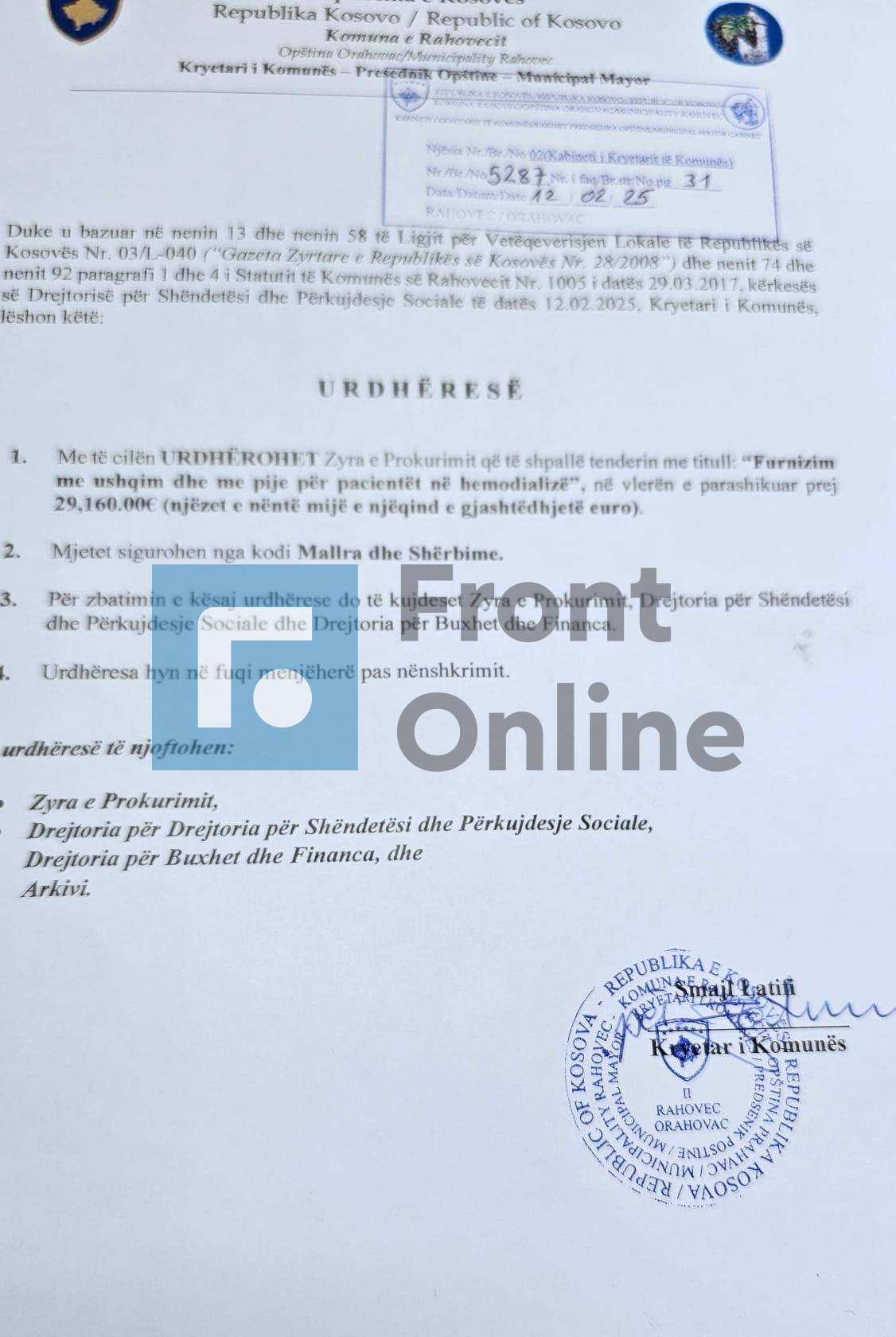 Komuna e Rahovecit e cila drejtohet nga Smajl Latifi përmes një vendimi ka anuluar tenderin për furnizim me ushqim për pacientet e Hemodializës që gjenden në këtë qytetet, deri sa të nijetit me ushqim i ka furnizuar pa kontratë nga një Qebaptore që operon në këtë komunë.