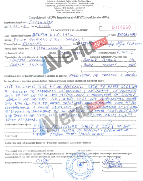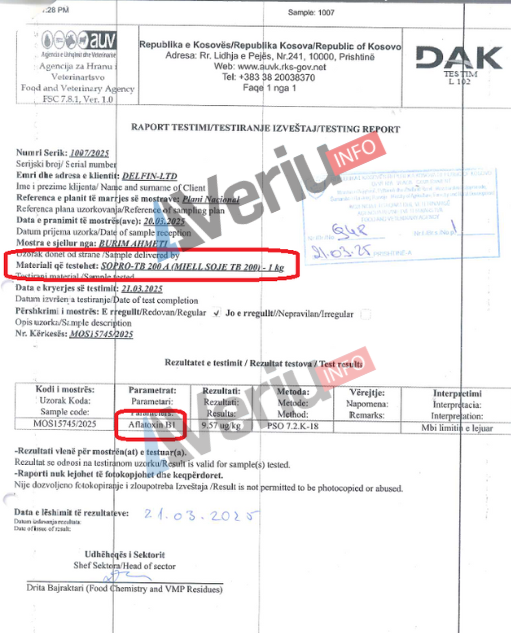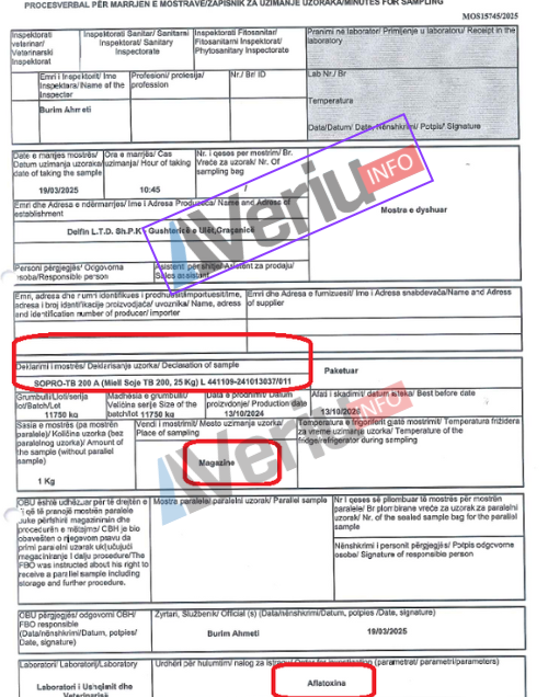 “Mbështetur në kërkesën e subjektit të lartëcekur (v.j. “DELFIN” L.T.D. Sh.P.K.) … me qëllim të prezencës në procesin e asgjësimit të produktit Soja TB 200 në sasinë prej 11,650 kg, duke u mbështetur në llojin e ushqimit …. ku është konstatuar se në bazë të raportit të analizave … të datës 21.03.2025 L.U.V. së aflatoksinës mbi vlerën e lejuar, andaj i njëjti është asgjësuar”, thuhet në procesverbalin e inspektorëve të AUV.