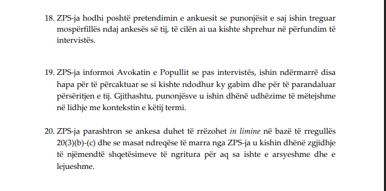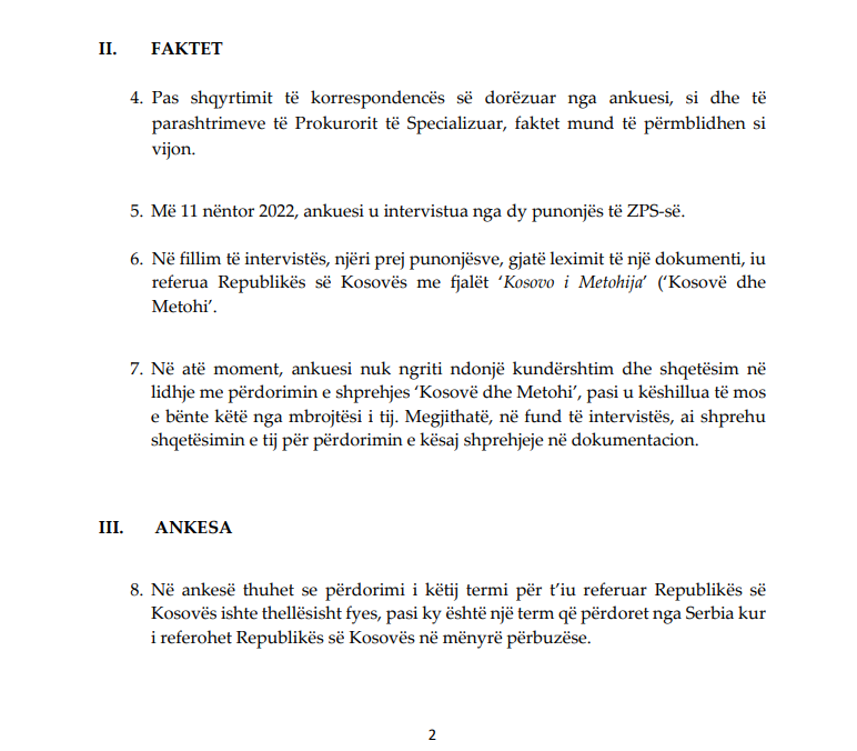 “Më 11 nëntor 2022, ankuesi u intervistua nga dy punonjës të ZPS-së. Në fillim të intervistës, njëri prej punonjësve, gjatë leximit të një dokumenti, iu referua Republikës së Kosovës me fjalët ‘Kosovo i Metohija’ (‘Kosovë dhe Metohi’. Në atë moment, ankuesi nuk ngriti ndonjë kundërshtim dhe shqetësim në lidhje me përdorimin e shprehjes ‘Kosovë dhe Metohi’, pasi u këshillua të mos e bënte këtë nga mbrojtësi i tij. Megjithatë, në fund të intervistës, ai shprehu shqetësimin e tij për përdorimin e kësaj shprehjeje në dokumentacion”, thuhet në ankesën e të intervistuarit drejtuar Avokatit të Popullit.