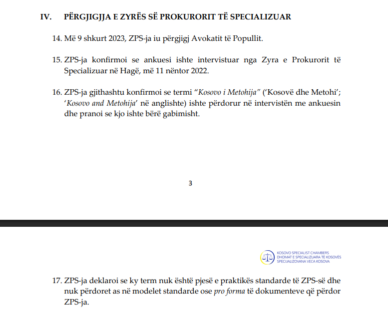 Avokati i Popullit i Dhomave të Specializuara të Kosovës ka pranuar një ankesë nga një i intervistuar i Gjykatës Speciale në Hagë se gjatë intervistimit nga dy punonjës të ZPS-së i ishin referuar Kosovës “Kosova dhe Metohi”.