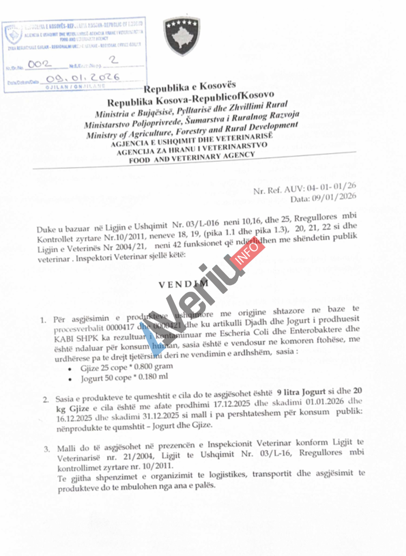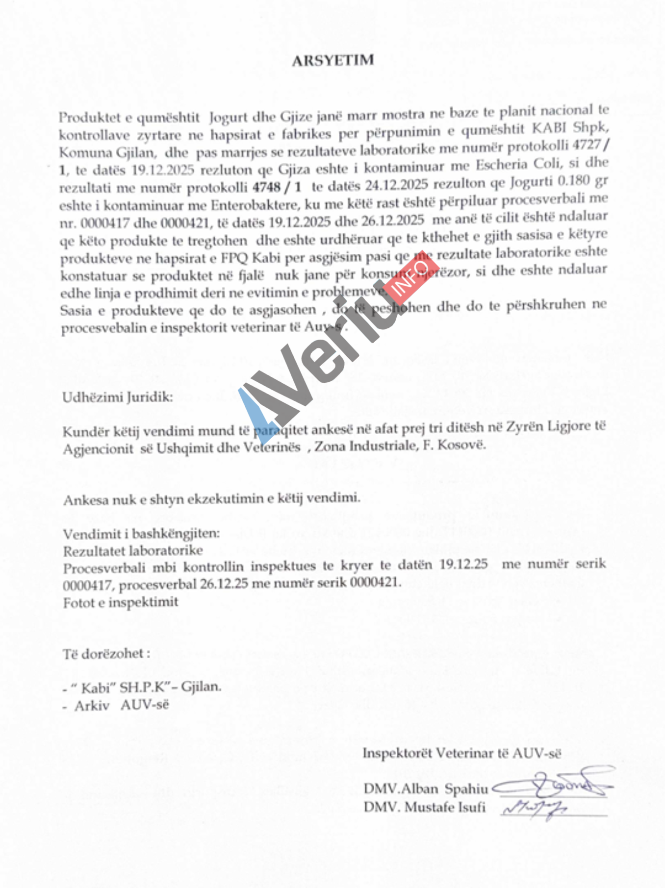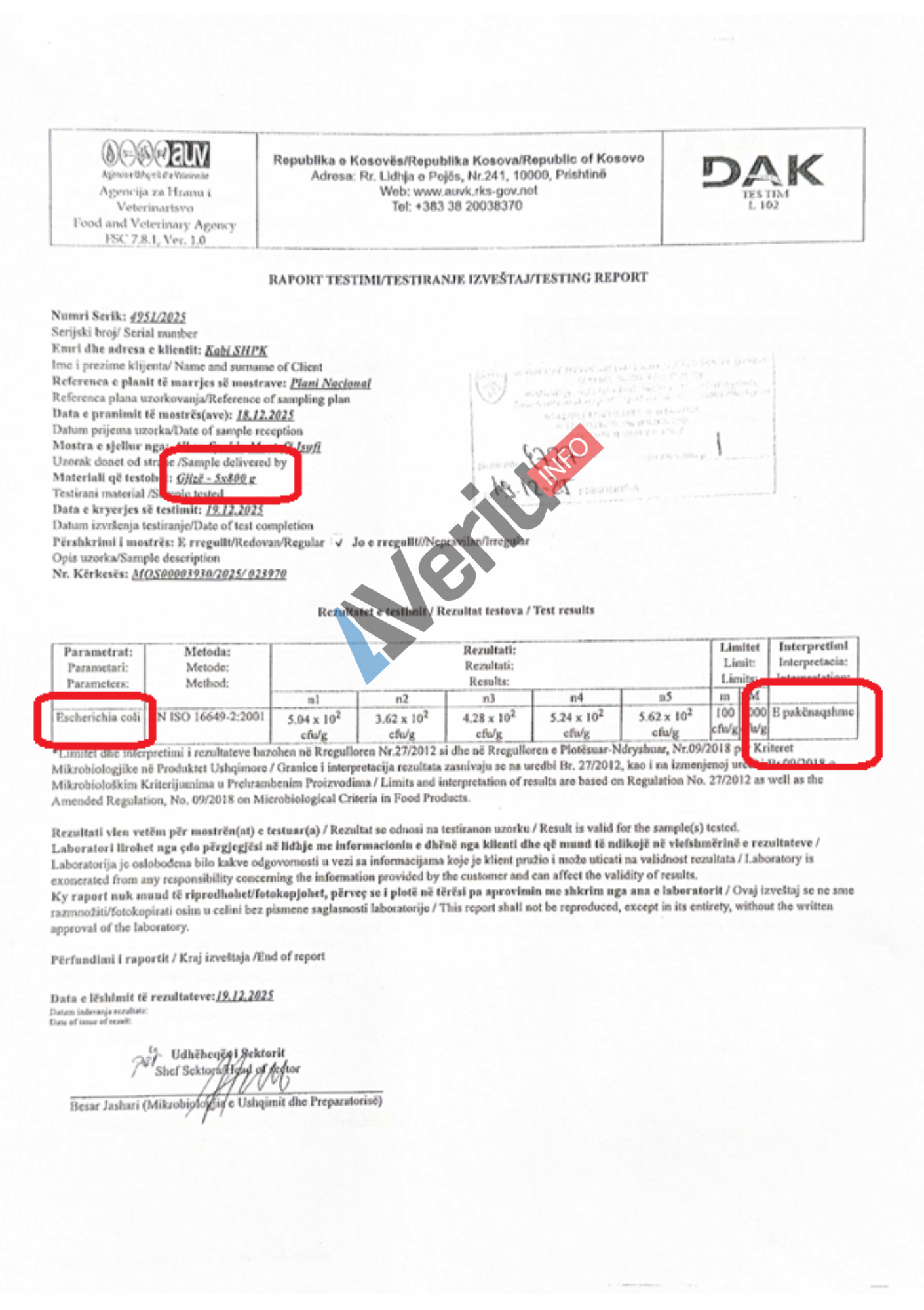 Veriu.info ka siguruar dy raporte të testimit të Agjencisë së Ushqimit dhe Veterinarisë, ku nga rezultatet e laboratorit konstatohet se dy produkte të Qumështores KABI në Gjilan kanë rezultuar se janë të kontaminuara me baktere të rrezikshme.