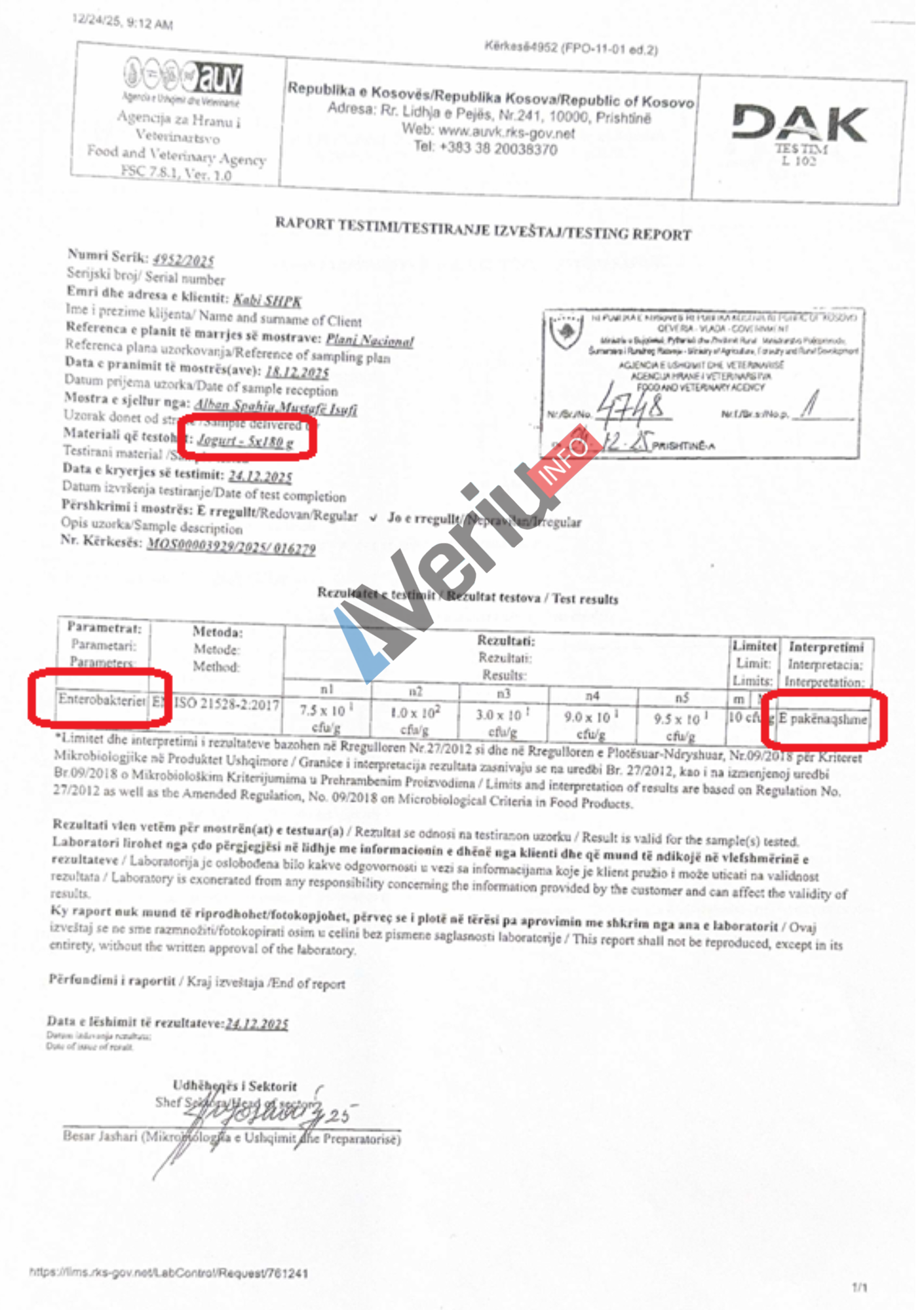 Më 18 dhjetor 2025 është testuar në laborator produkti Jogurt 180 gramë, rezultatet e të cilit kanë dalë të pakënaqshme në kriterin “Enterobaktere”.