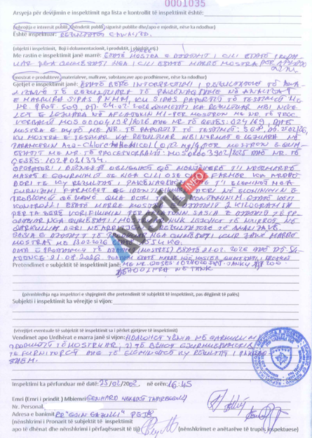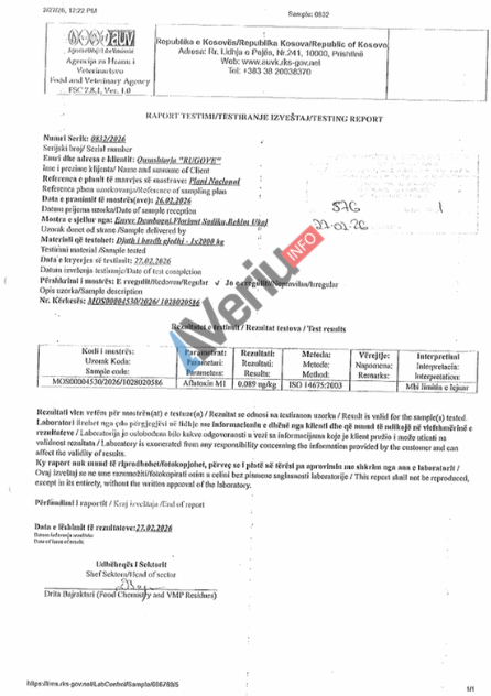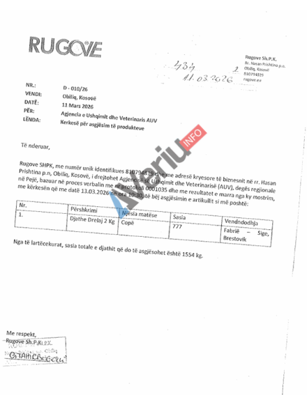 Pas analizave të bëra më 27 shkurt 2026, ka rezultuar se produkti Djath i bardh gjedhi ka dalë mbi nivele të lejuara në Aflatoxin M1, me ç’rast inspektorët veterinarë ia kanë ndaluar Qumështores Rugove vënien në qarkullim të këtij produkti.