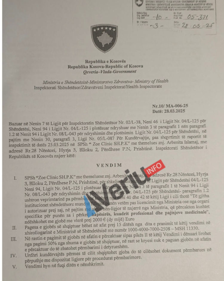 Në kuadër të një hulumtimi për parregullsitë në sektorin privat të shëndetësisë, Veriu.info ka siguruar një vendim të Inspektoratit Shëndetësor të Ministrisë së Shëndetësisë me të cilin “Zoe Clinic Sh.P.K.” është gjobitur me dy (2) mijë euro për ushtrim të veprimtarisë pa licencë, klinikë kjo që merret me terapi fizikale për fëmijët.