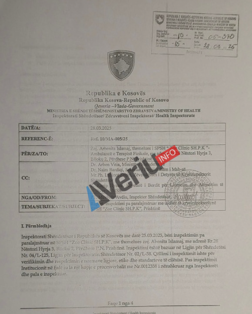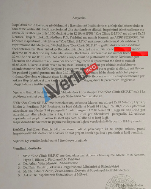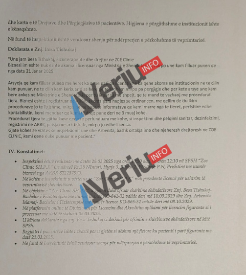 Veriu.info ka siguruar edhe raportin e inspektimit të Inspektoratit Shëndetësor, ku bëhet e ditur se për shkak të shkeljes së Ligjit për Shëndetësi, në fund të inspektimit është vendosur shenja për ndërprerjen e përkohshme të veprimtrisë së “Zoe Clinic Sh.P.K.”.