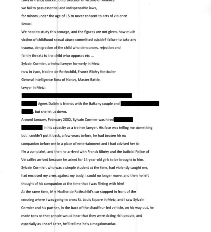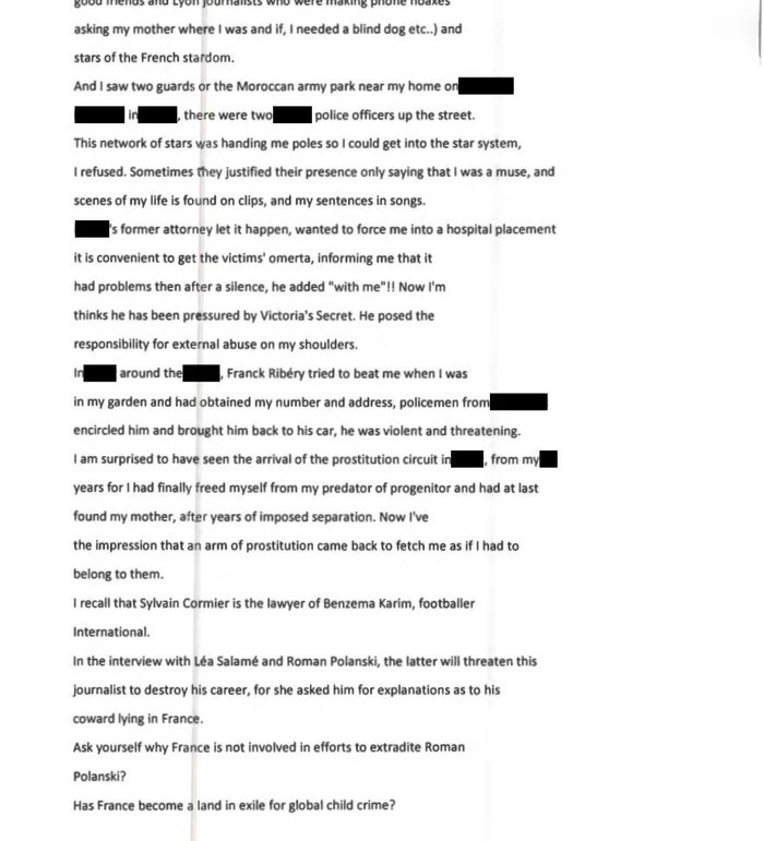 Një fragment thotë: “Franck Ribery u përpoq të më rrihte ndërsa isha në kopshtin tim dhe kishte siguruar numrin tim dhe adresën time; policë e rrethuan dhe e shoqëruan deri te makina e tij”.