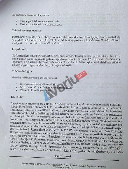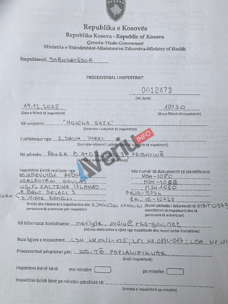 Me këtë procesverbal inspektimi, klinikës estetike “Miliona” të Salih Imerit i ishte ndaluar ofrimi i shërbimeve shëndetësore deri në marrjen e licencës.