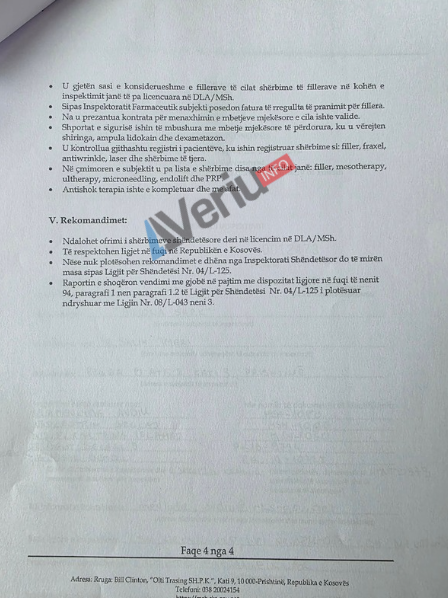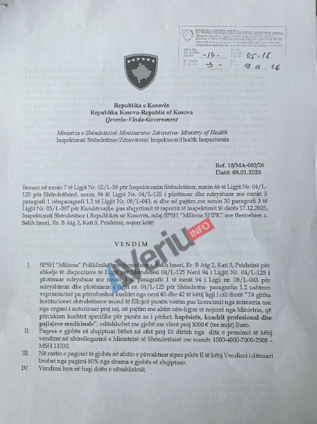 Në kuadër të një hulumtimi për parregullësi në ofrimin e shërbimit të të injektimit të Botox-it dhe Filler-it, Veriu.info ka siguruar një vendim të Inspektoratit Shëndetësor me të cilin është gjobitur me 3 mijë euro Subjekti Privat Shëndetësor “Miliona” Sh.P.K. për shkelje të Ligjit për Shëndetësi.