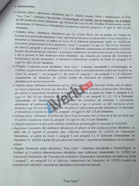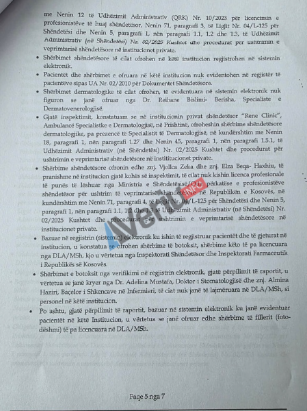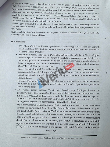 “Rene Clinic” gjatë këtij inspektimi është gjetur duke ofruar shërbime shëndetësore me personel të huaj të palicencuar (Almina Haziri). Po ashtu kryente shërbime shëndetësore dermatologjike pa prezencë të specialistit të dermatologjisë në kundërshtim me aktet ligjore në fuqi.