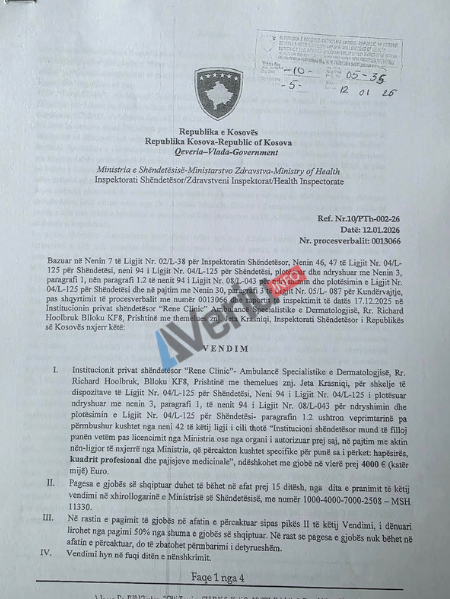 Veriu.info ka siguruar një vendim të Inspektoratit Shëndetësor të muajit janar me të cilin “Rene Clinic” është gjobitur me 4 mijë euro për shkelje të Ligjit për Shëndetësi.