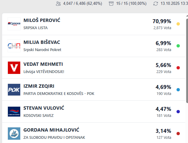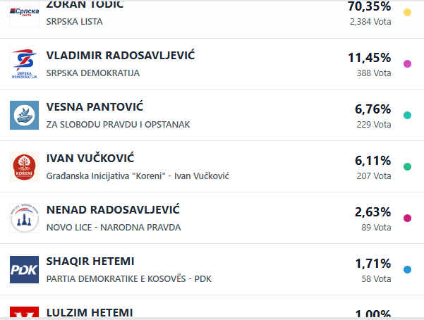 Ilir Peci i PDK’së në Zveçan: 73 vota ose 1.85 për qind.