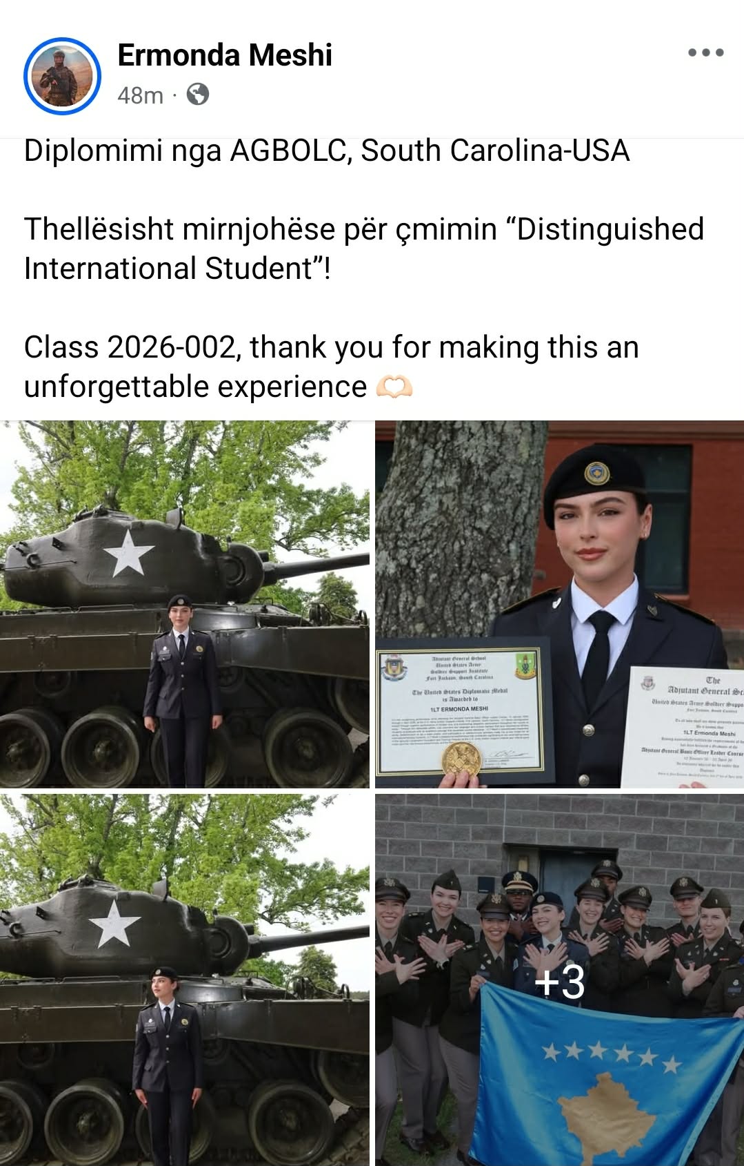 Togerja e FSK-së, Ermona Meshi është diplomuar me sukses në Adjutant General School të Ushtrisë së Shteteve të Bashkuara, duke u vlerësuar me medaljen prestigjioze “United States Diplomatic Medal” si studente ndërkombëtare e dalluar.