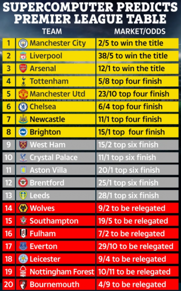 Tabela e parashikuar nga superkompjuteri për sezonin 2022/23 në Premierligë: