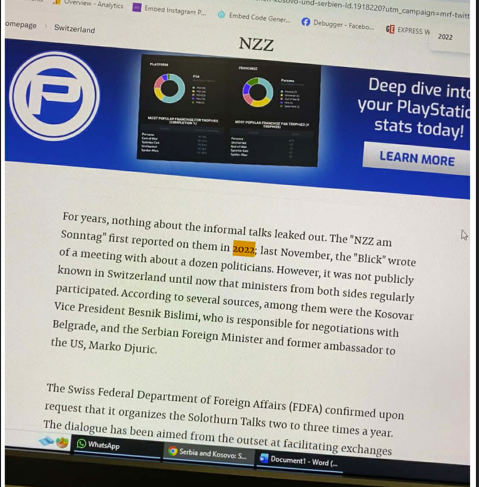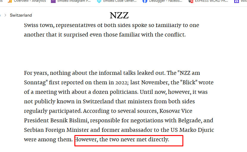 Gazeta zvicerane “NZZ” ka saktësuar raportimin e saj të djeshëm për takimet diskrete në Solothurn të Zvicrës, duke thënë se ndonëse Besnik Bislimi e Marko Gjuriq kanë qenë pjesëmarrës, ata s’janë takuar direkt mes vete.