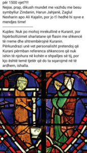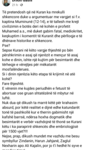 “Të pretendosh që në Kuran ka mrekulli shkencore duke u argumentuar me vargjet si f.v. kaptina Muminunë (12-14), e të tallesh me krejt civilizimin e botës deri në kohën e profetit Muhamed a.s., më duket gabim fatal, mediokritet, keqkuptim i komentit të Kuranit dhe përlloqje e të dhënave historike e shkencore“, ka shkruar Gashi në Facebook.