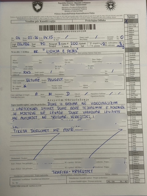 Pas identifikimit nga zyrtarët policorë, siç thuhet në njoftim, ndaj vozitësit janë shqiptuar masa ndëshkuese në përputhje me legjislacionin në fuqi, konkretisht, gjobë në vlerë prej 200 euro, 2 pikë negative, dhe ndalesë e patentë-shoferit për tre muaj.
