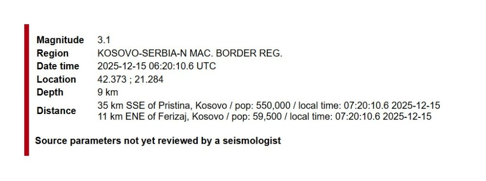 Sipas EMSC-së, tërmeti ka ndodhur më 15 dhjetor 2025, në orën 06:20:10 sipas kohës universale (UTC), apo 07:20 sipas kohës lokale. Epiqendra e tërmetit është lokalizuar në koordinatat 42.373° N, 21.284° E, me një thellësi prej rreth 9 kilometrash.