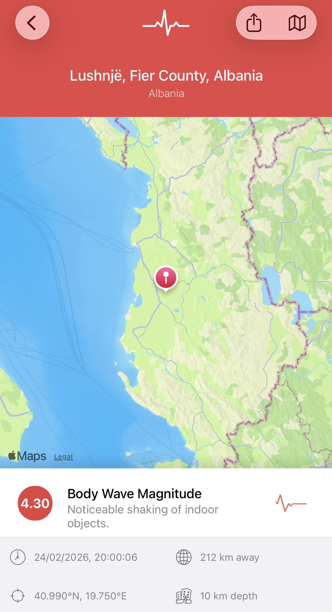 Një tërmet me magnitudë 4.3 është regjistruar tw martwn pranë qytetit të Lushnjë, në Shqipëri.