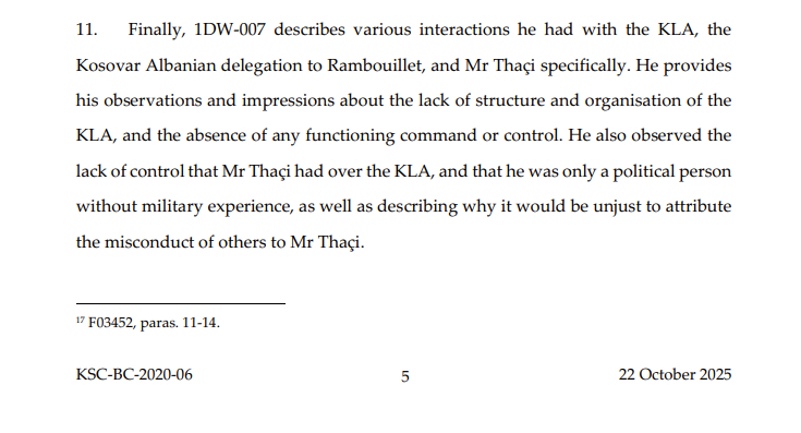 “ Së fundmi, 1DW-007 përshkruan ndërveprimet e ndryshme që ai pati me UÇK-në, delegacionin e shqiptarëve të Kosovës në Rambuje dhe konkretisht me z. Thaçi. Ai jep vëzhgimet dhe përshtypjet e tij në lidhje me mungesën e strukturës dhe organizimit të UÇK-së, dhe mungesën e çdo komande ose kontrolli funksional. Ai gjithashtu vëzhgoi mungesën e kontrollit që z. Thaçi kishte mbi UÇK-në, dhe se ai ishte vetëm një person politik pa përvojë ushtarake, si dhe përshkruan pse do të ishte e padrejtë t’i atribuohej sjelljes së keqe të të tjerëve z. Thaçi.”, thuhet në dokumentin e mbrojtjes.