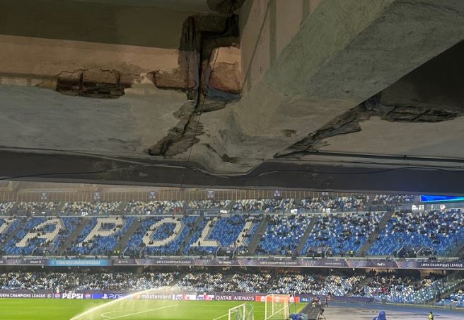 Aty shihet se si është prishur betoni i stadiumit dhe është në gjendje të rrezikshme për shembje.