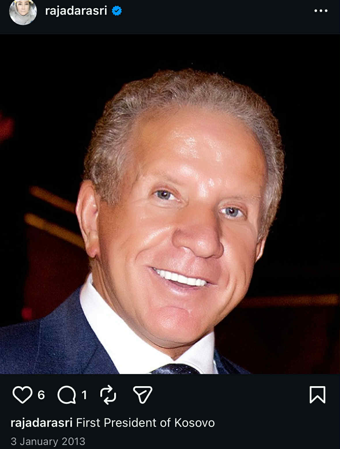 Herë të tjera, në dhjetëra postime për Pacollin në “Instagram”, Rajadarasri e identifikonte ish-zëvendëskryeministrin kosovar si “presidenti i parë i Kosovës” – sigurisht gabimisht. Por, Pacolli e ka kultivuar ndër vite një prirje të vazhdueshme për t’u vetëquajtur “president”.