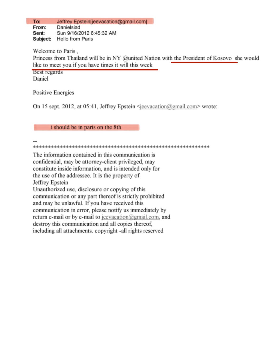 Bazuar në bisedat e publikuara javën e shkuar, Daniel Siad, një bashkëpunëtor i afërt i Jeffrey Epstein, e njofton pedofilin amerikan që princesha e Tajlandës i ka kërkuar takim në Nju Jork, ku “do të jetë me Presidentin e Kosovës”. Aty nuk përmendet emri direkt Pacolli, i cili asokohe mbante pozitën e zv/kryeministrit.