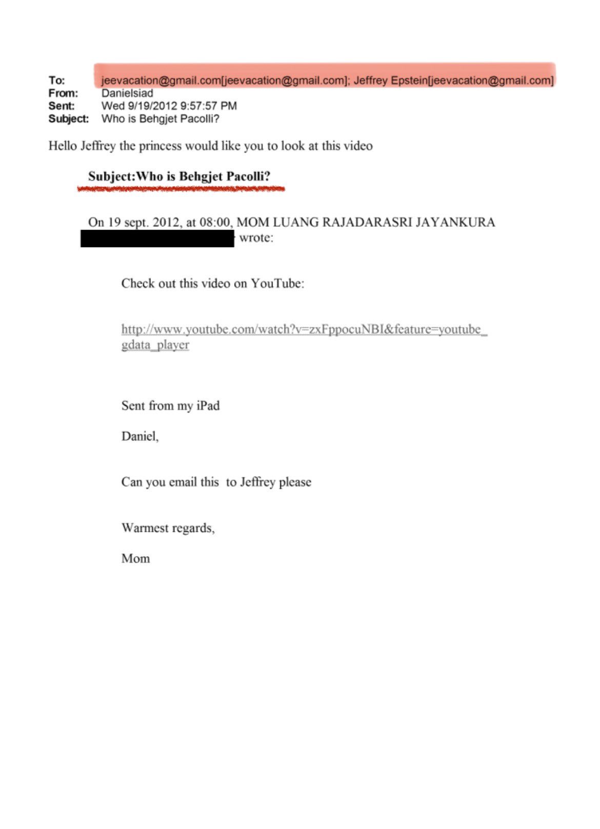 Me titullin “president”, princesha tajlandeze dyshohet t’i jetë referuar pikërisht Pacollit në disa komunikime të zbardhura që lidhen me dosjen “Epstein”.