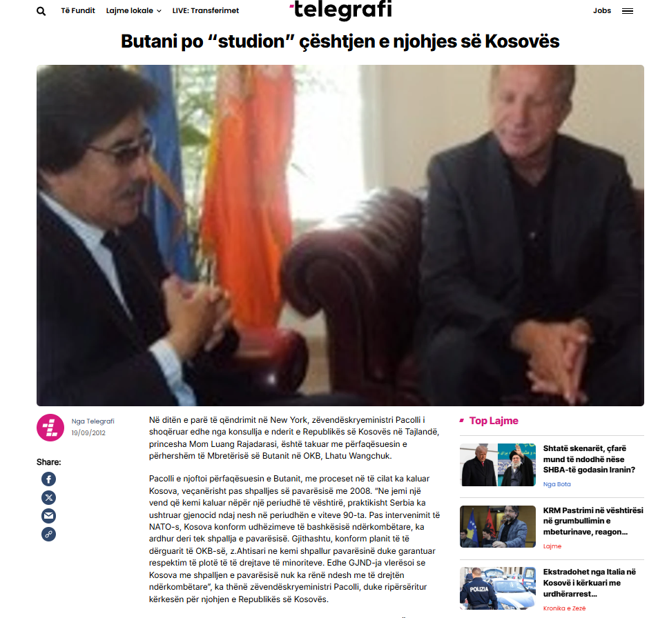 Paparaci ka siguruar një fotografi nga takimi i Behgjet Pacollit me përfaqësuesin e përhershëm të Mbretërisë së Butanit në OKB, Lhatu Wangchuk, të realizuar në Nju Jork më 19.09.2012, e cila shënonte ditën e parë të vizitës zyrtare të zv/kryeministrit Pacollli në ShBA.