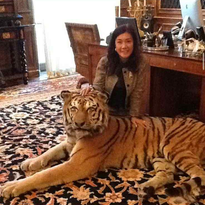 Fotografia shfaq shoqëruesen dhe miken e afërt të Pacollit pranë një tigri të balsamosur brenda njërës prej dhomave që ndodhet brenda shtëpisë luksoze dhe makabre të financierit amerikan.
