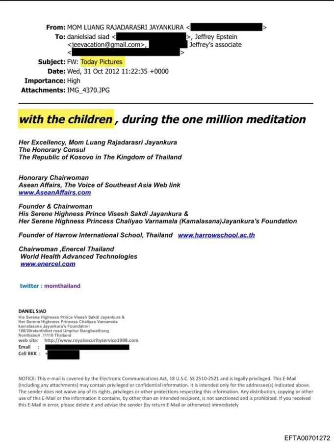Dërgesa e fotografive të tilla në adresë të pedofilit Epstein, ngre dyshime serioze mbi veprimtarinë e Rajadanasrit, e cila është themeluese dhe drejtuese e një shkolle private në Bangkok të Tajlandës, e cila regjistron fëmijë nga 18 muajsh deri në 18 vjeç.