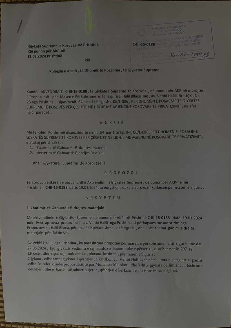 “Me aktvendimin e Gjykatës Supreme që punon për AKP-në Prishtinë C-III-15-0188 datë, 19.01.2024 nuk është aprovua propozimi av. Vehbi Halili nga Prishtina si përfaqësues me autorizim nga Propozuesit, Halil Bllaca, për masë të përkohshme e të sigurisë, dhe është zbatua gabim e drejta materiale për faktin se: Avokati ka parashtruar propozim për masën e përkohshme e të sigurisë me dat. 27.06.2023, kjo gjykatë veprimin e saj konfuz e bazon duke e përsëritë, disa herë nenin 297 të LPK/së, dhe sipas saj, nuk qenka, plotësua kushtet për masën e sigurisë”, thuhet në ankesën e deponuar në apelin e Dhomës së Posaçme.
