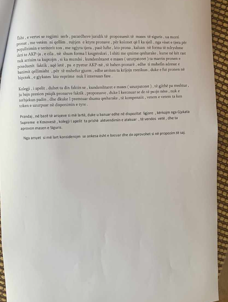 “Ky trup gjykues bie në kundërshtim me vetveten kur konsideron se rreziku veçse është shkaktuar, nga kundërshtarët e masës, sepse kjo pronë qenka hipotekë, çka është e vërtetë dhe ky veprim i uzurpatorëve mbetet i pandëshkuar nga gjykate, e cila qëllimisht ju ndihmon me mos-aprovim të kërkesës për masën e sigurisë, e cila do të ishte e nevojshme, për faktin se kundërshtarët e masës, tani edhe kanë mundësi ta shesin pronën e uzurpuar, ta tjetërsojnë” thuhet në ankesë.
