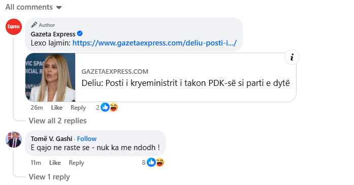 Deklarata e deputetes së zgjedhur të Partisë Demokratike të Kosovës, Blerta Deliu se i takon kësaj partie posti i kryeministrit në rast se Lëvizja Vetëvendosje dështon ta formojë Qeverinë e re, e nxiti një reagim të Tomë Gashit.