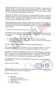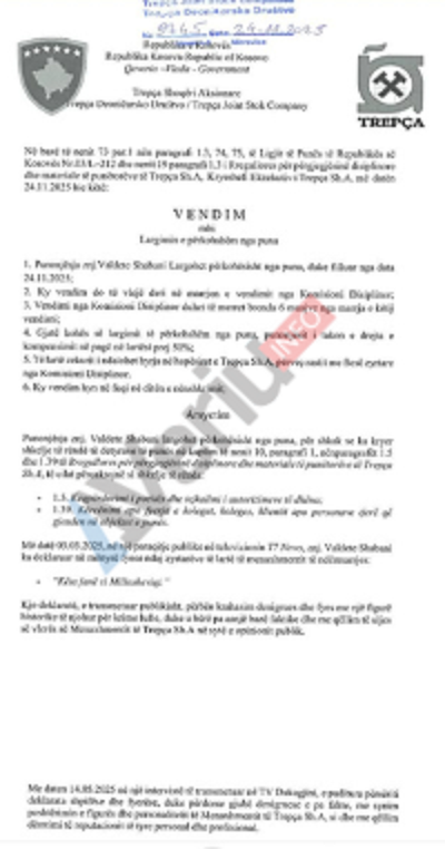 Në këtë vendim suspendimi thuhet se Valdete Shabani ka bërë deklarata të pavërteta lidhur me kushtet e punës dhe gjendjen në njësinë biznesore duke pretenduar se është pranë shkatërrimit. Gjithashtu ka komentuar në platforma online të medieve lokale duke ofenduar menaxhmentin e ndërmarrjes Trepça.
