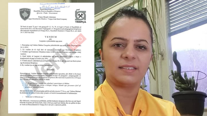 Menaxhmenti i ndërmarrjes Trepça në krye me Kryeshefin Faton Ahmetin, ka larguar nga puna përkohësisht, Valdete Shabanin, me arsyetimin se “ka kryer shkelje të rëndë të detyrave të punës”, raporton Gazeta Online Veriu.info.
